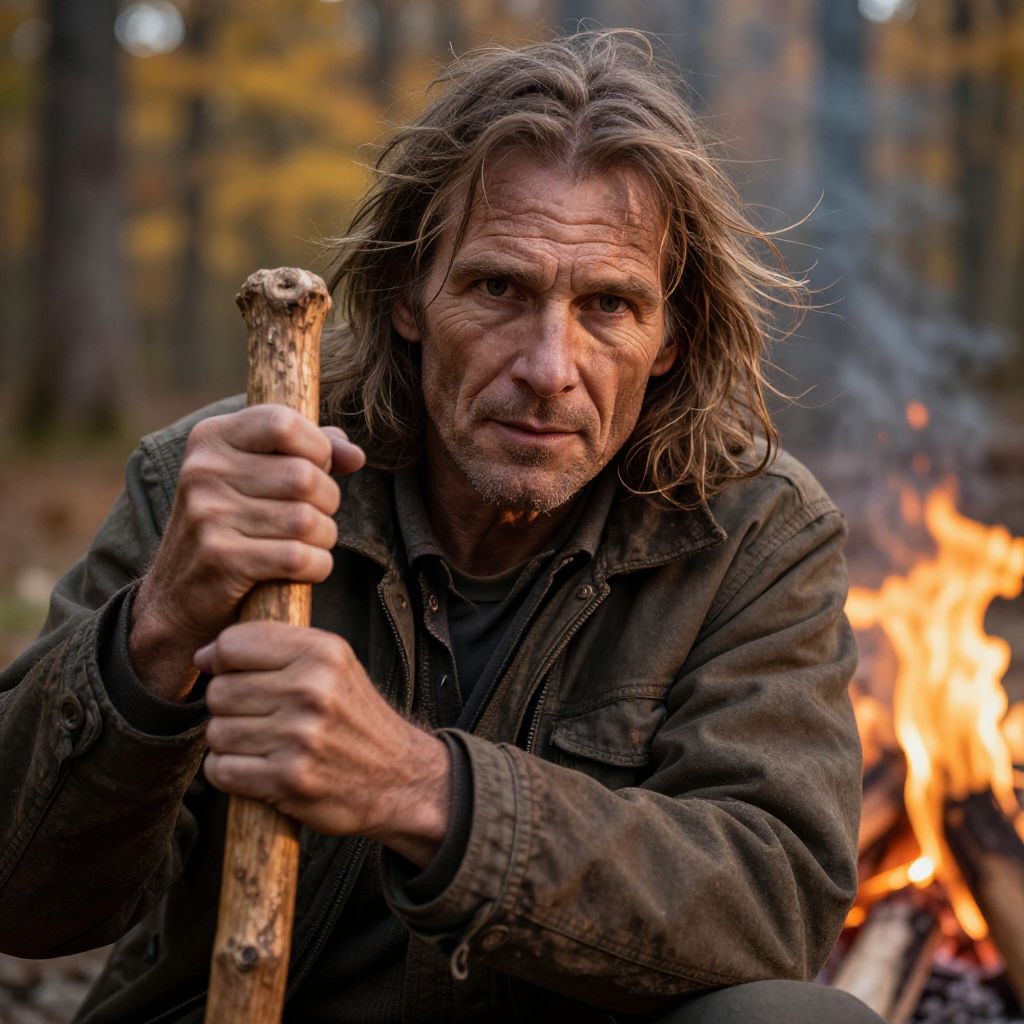 Candid, emotive portrait of a rugged outdoorsman, his weathered hands grasping a wooden staff, illuminated by the golden light of a crackling campfire, deep creases etched on his worn face, long hair tousled by wind, forest backdrop, autumnal hues, warm ambiance. Man has masculine face and piercing eyes