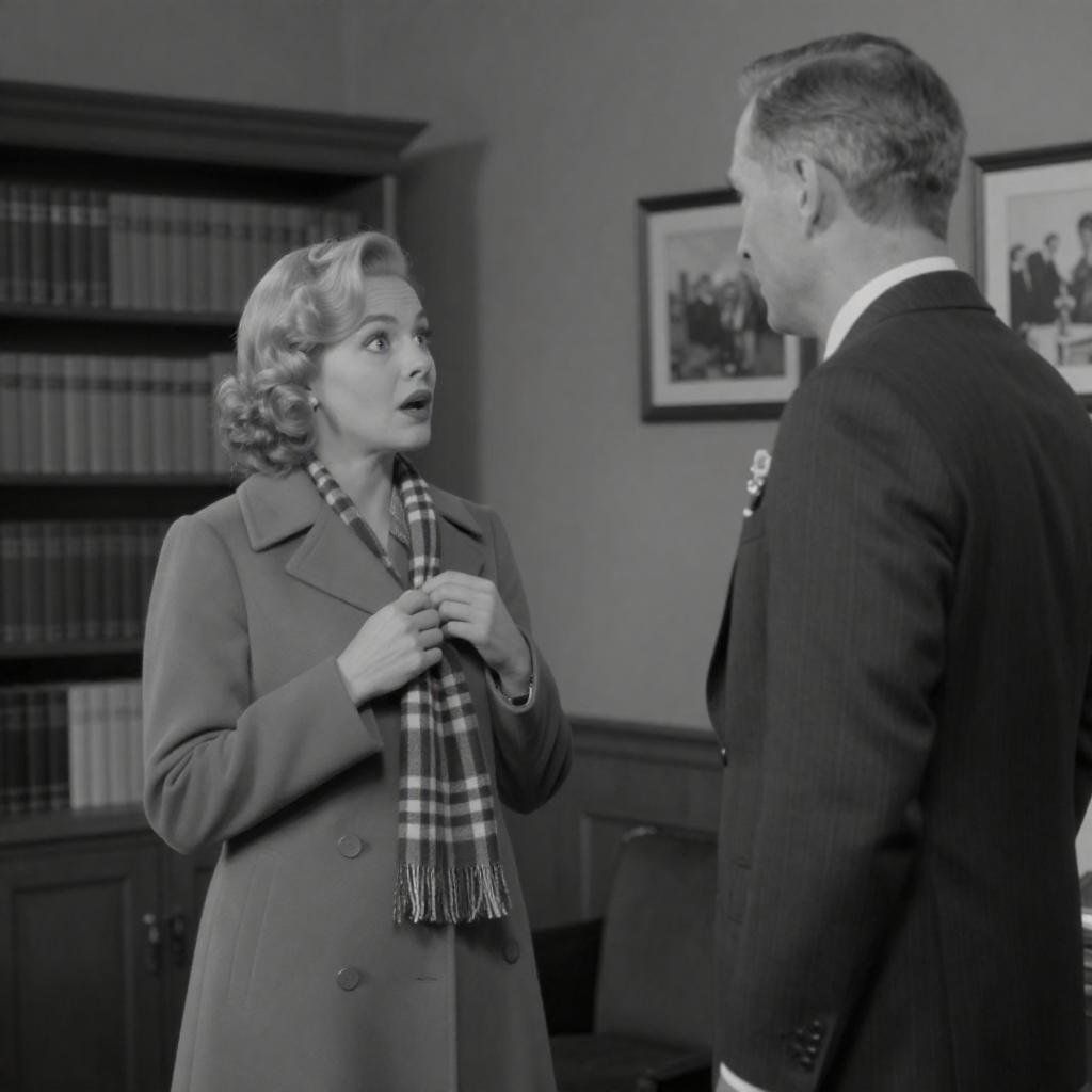 Black-and-white photograph of a man and woman in a vintage-style room. The man, with short gray hair, wears a pinstripe suit and white shirt, facing the woman. She has blonde hair, wears a ured coat, and holds a plaid scarf. Bookshelves and framed pictures are in the background. The woman looks surprised, while the man looks at her.