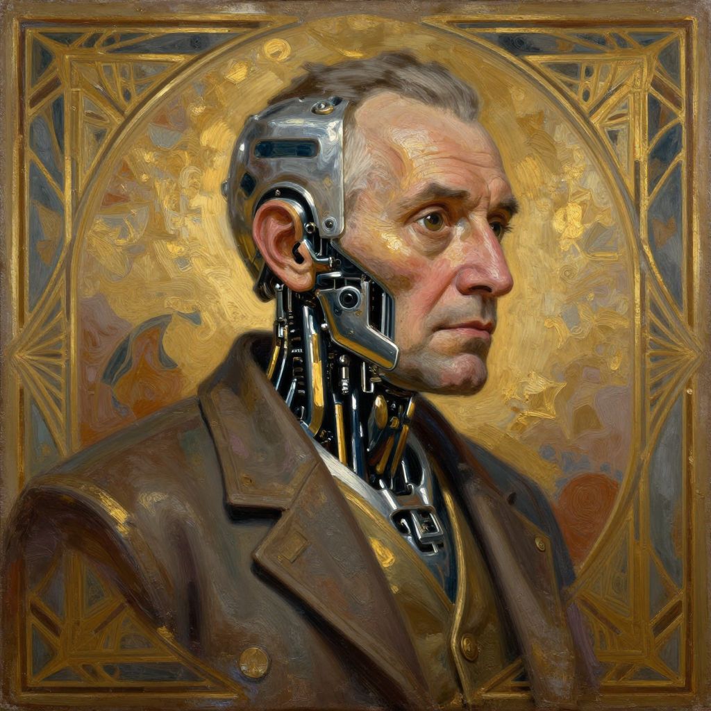Portrait bust oil painting of an old cyborg man by jama jurabaev with one robot eye, 1/4 profile, art deco borders, art deco background, shiny, metal, diffused lighting, gold, cyborg dc, brass, no glasses, bust portrait, steam punk, wearing a worn out suit, extremely detailed, brush hard, brush strokes, dorothea lange, migrant mother, artstation