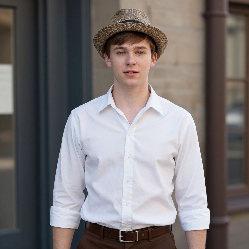 Photograph of a young Caucasian man with fair skin, brown hair, wearing a beige straw hat, white button-up shirt, and dark brown pants,