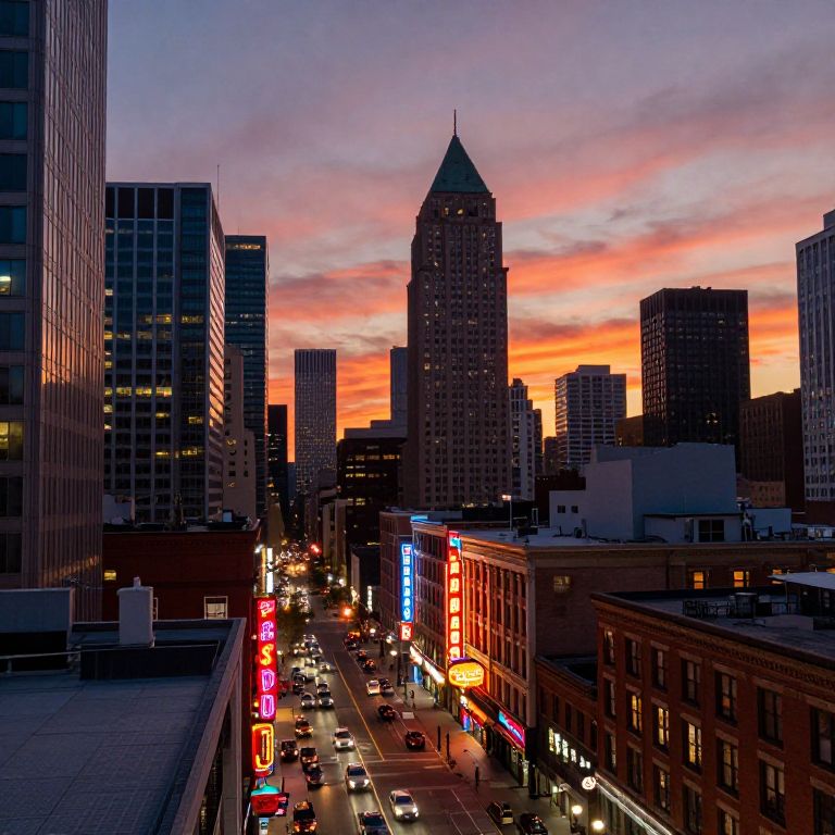 U.S. cityscape at dusk with vibrant neon signs and bustling streets, showcasing modern skyscrapers alongside historic buildings under a dynamic sunset sky, capturing the essence of urban life and architectural diversity in the U.S.