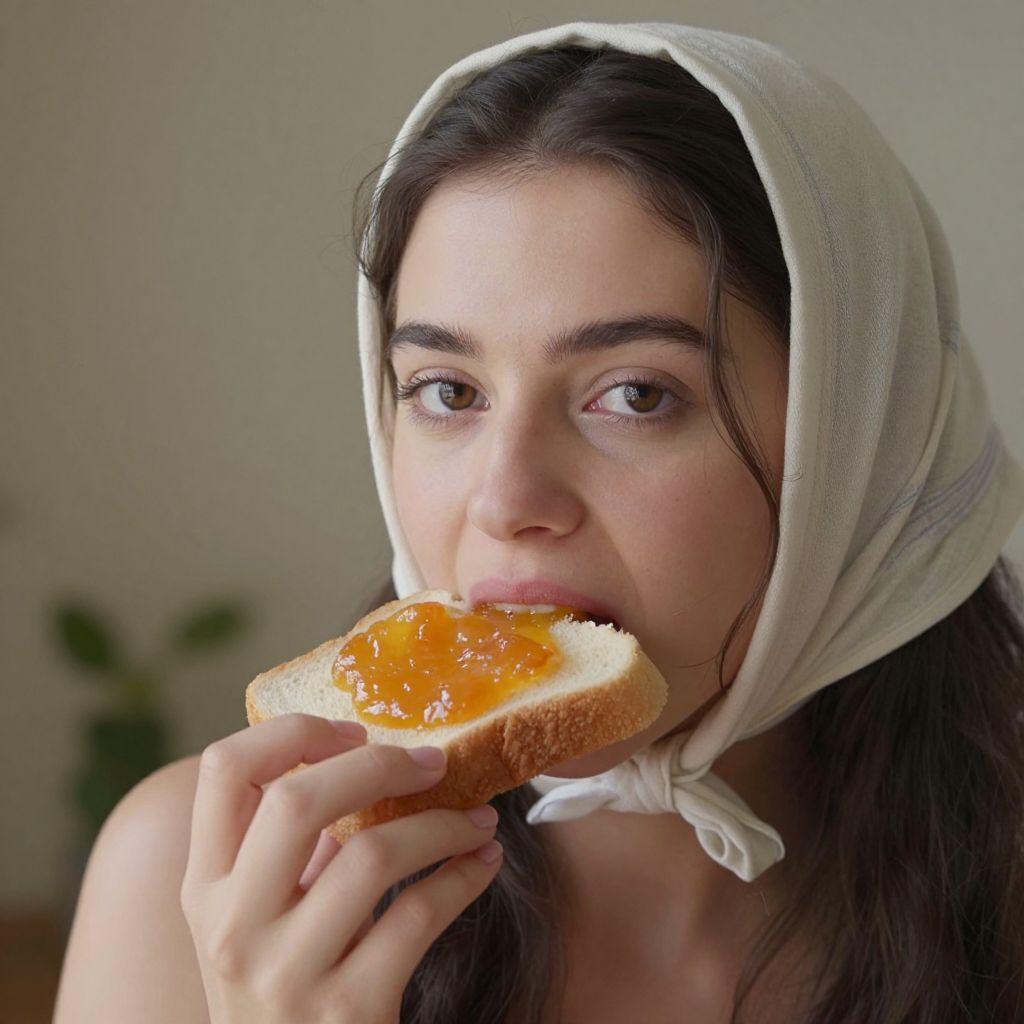 Young woman with headscarf biting into a slice of bread with apricot jam