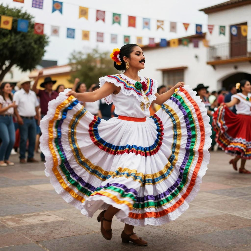 Photograph of a smiling woman in a vibrant red and blue Mexican folk dress, spreading skirt wide, against a dramatic sunset sky.