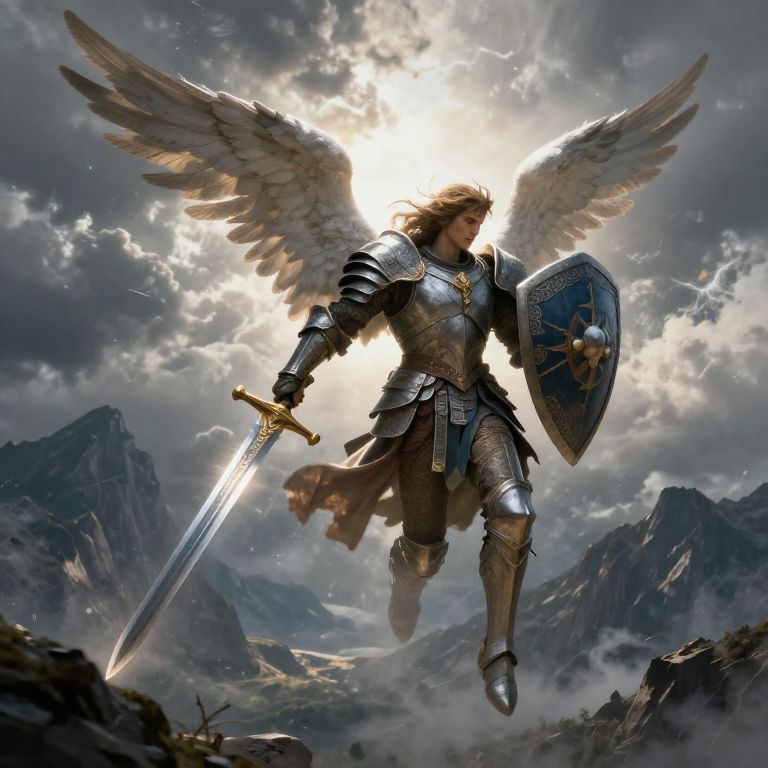 Heroic angel with sword and shield soaring over a stormy mountain landscape, dynamic pose with wind-blown feathers, radiant light breaking through dark clouds, detailed armor with medieval engravings, palpable sense of divine strength and courage, fantasy illustration style.