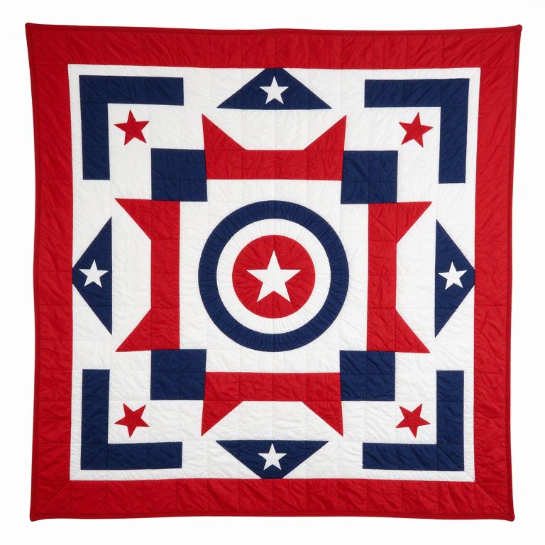 Quilt featuring a patriotic design with red, white, and blue geometric shapes, stars, and a central circular star pattern.