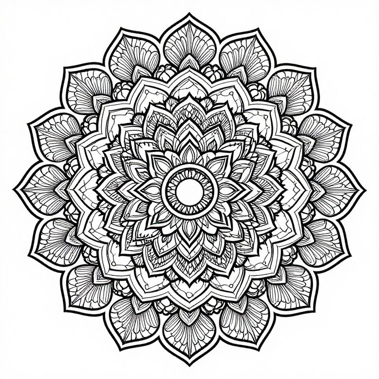 Ornate mandala design featuring intricate concentric floral patterns radiating outward, showcasing symmetrical layers of delicate petals and geometric shapes in bold black lines against a stark white background.