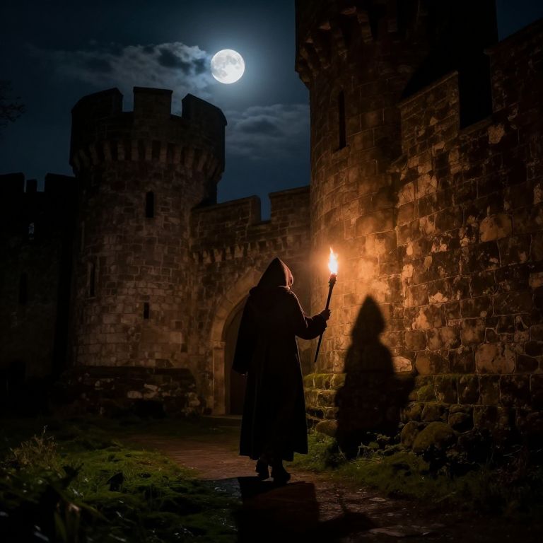 Photograph of a medieval scene at night. A hooded figure in dark robes holds a torch, illuminating a stone castle wall. The full moon shines brightly in the dark blue sky above, casting a silvery glow. The torchlight creates sharp contrasts on the textured, weathered stones. A shadowy figure stands in the foreground, partially obscured by the torchlight. The ground is grassy and uneven. The castle's architecture includes tall, rectangular towers with crenellations. The image evokes a sense of mystery and historical ambiance.
