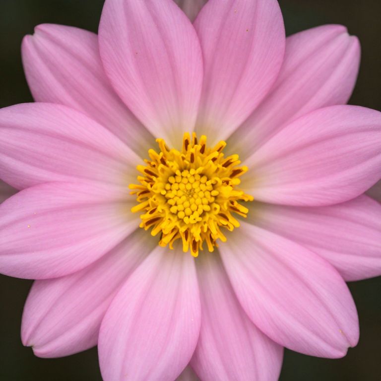 Photograph of a single, fully bloomed pink daisy-like flower with delicate, light pink petals radiating from a vibrant yellow center. The petals are smooth and slightly curved, with subtle veins visible. The yellow center is dense and textured, composed of numerous tiny, pointed florets. The background is dark, providing strong contrast that highlights the flower's soft colors and intricate details. The image is sharply focused, emphasizing the flower's natural beauty and symmetry.