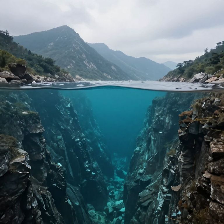 An ethereal divide reveals a tranquil mountainous landscape above water, mirrored by a submerged world where rocky cliffs descend into an abyssal canyon, defying the separation between land and sea.