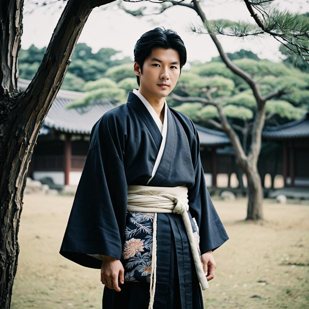 Portrait of a young Asian man with black hair and black eyes wearing a traditional Korean hanbok with floral embroidery. The image is taken outdoors with a blurred background featuring trees and traditional Korean architecture. The man is looking directly at the camera with a calm expression.