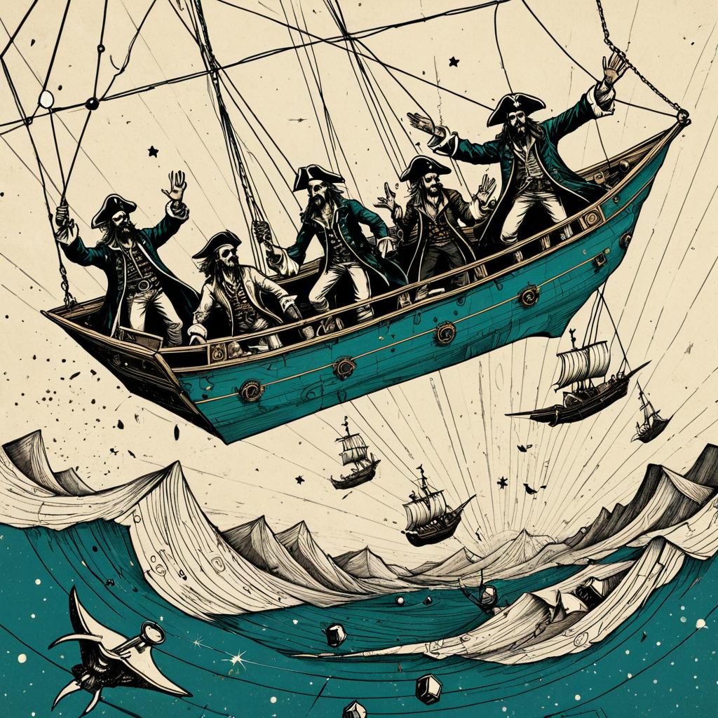 Sketch 2 pirates floating in space with their heads missing except their eyeballs, distorted arms coming from the abyss trying to grab onto the pirates with mangled fingers, in the style of steampunk, mixed media, paper cut outs and distress with noise and scratches, ultra 8k, high detail, sepia and teal, geometric shapes, Golden ratio, extra detail, - Upscaled (Light) by