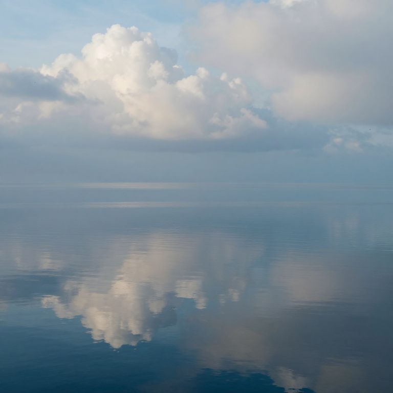 Photograph of a calm, reflective ocean with fluffy white clouds mirrored in the water, set against a blue sky with soft sunlight.