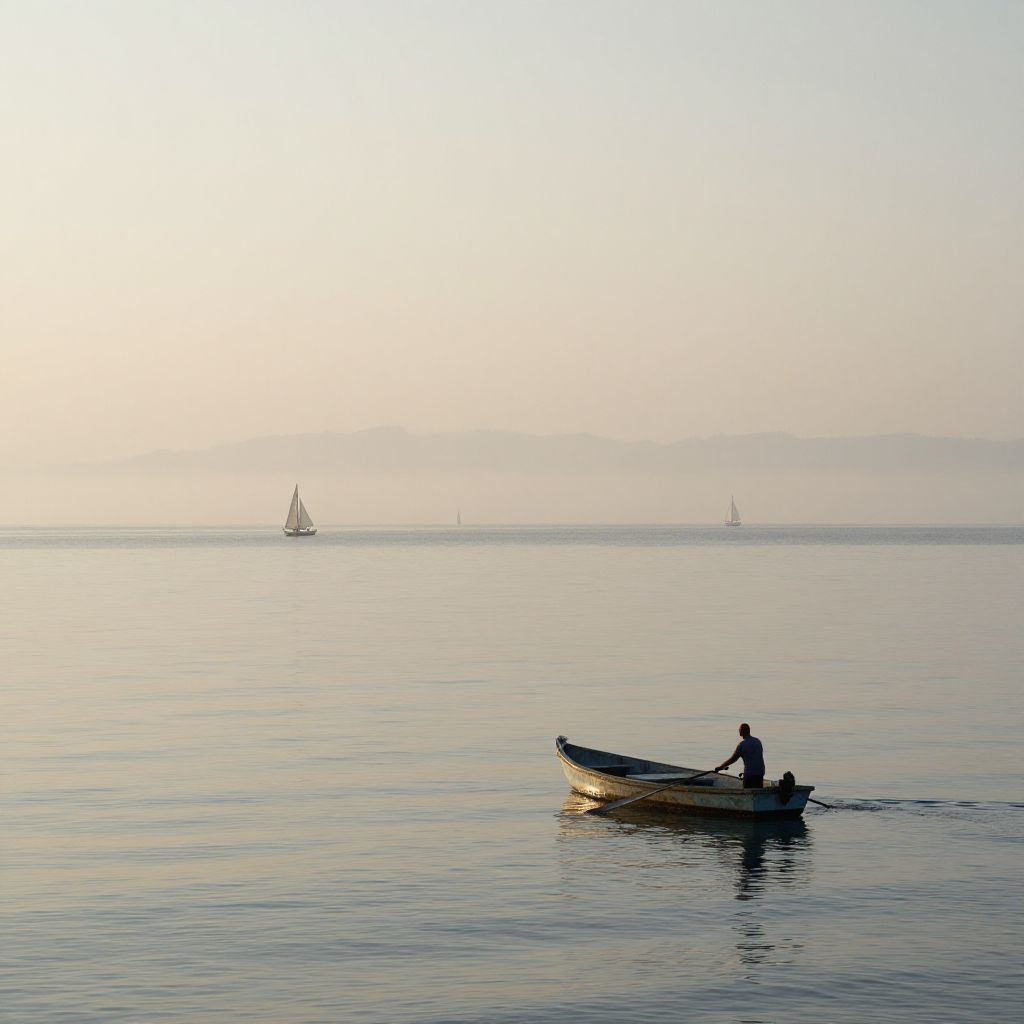 A wide-angle shot of a serene sea during early morning, with a calm, glass-like surface stretching to the horizon, distant white sails on a quiet bay, a lone fisherman in a weathered boat gently rowing under a misty horizon, soft sunlight filtering through the morning fog
