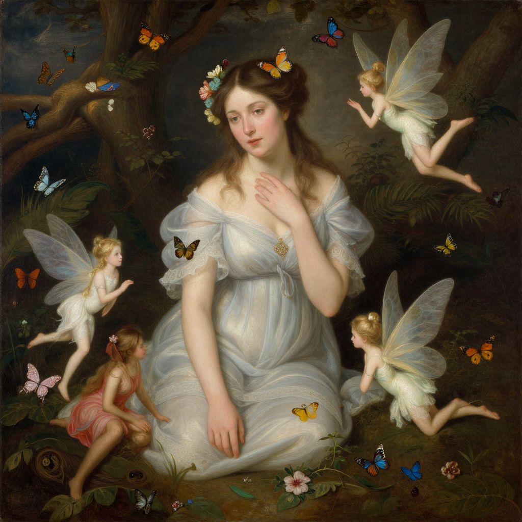 Painting of a fair-skinned woman with green fairy wings, wearing a gold, leaf-adorned dress with peacock feather accents, against a