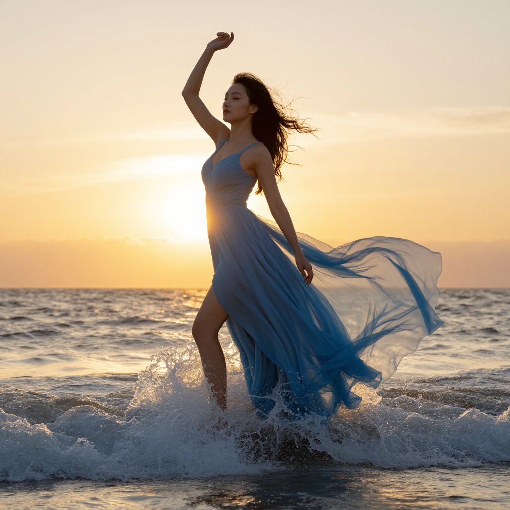 Photograph of a woman in a flowing blue dress standing in ocean waves at sunset, her hair and dress blowing in the wind.