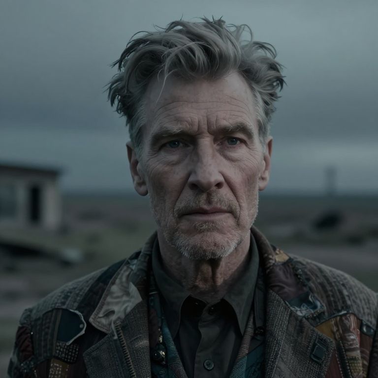 Envision a hyper-realistic portrait reminiscent of David Lynch's cryptic aesthetics, portraying a man's face in close proximity with eyes that seem to gaze both within and beyond simultaneously. Soft, dramatic shadows from the lighting accentuate his aged countenance, instilling an aura of mystique and contemplation as he stands isolated amidst a desolate, post-apocalyptic terrain. The color scheme is subdued, featuring tones of gray and blue that embody the bleakness of the setting while emphasizing the complex textures of his attire—melding fragments from different epochs into a patchwork of styles. This emotional spectrum leads viewers on an odyssey from despair to hope, as they delve into the multifaceted emotions carved upon every crease of his visage, encouraging them to ponder the enigmas concealed in his mesmerizing stare.