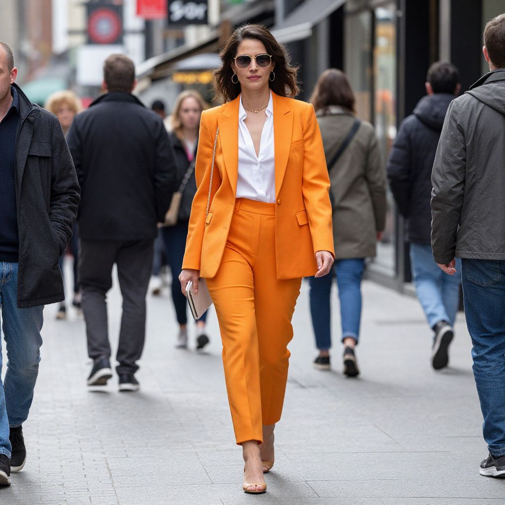 Photograph of a confident woman in a bright orange pantsuit, white top, and sunglasses, walking in a busy city street with blurred pedestrians.