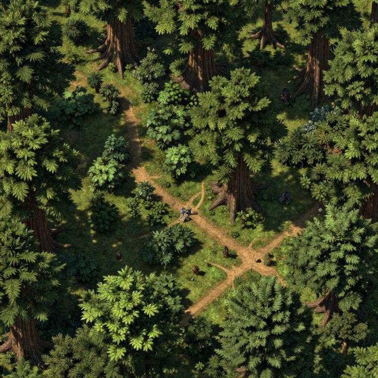 Dense forest battle map showcasing an intricate layout of towering ancient trees, thick underbrush, and winding pathways, illuminated by dappled sunlight filtering through the leafy canopy, perfect for tactical RPG encounters and strategic gameplay.