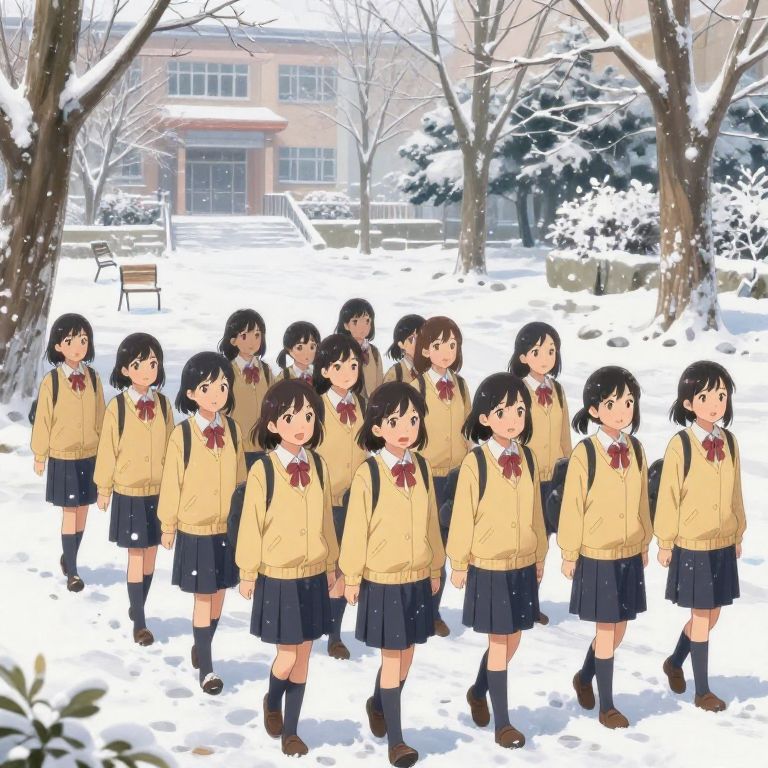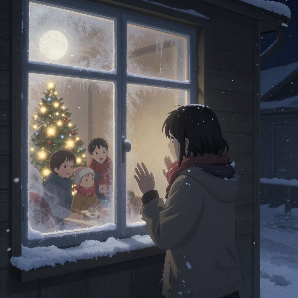 A young woman standing outside in the snow, wearing tattered clothes, leaning softly against a frosty window from the outside, her hands and face close to the icy glass, snowflakes gently falling around her, view from behind, cold winter night, dim moonlight reflecting on the snow, soft glow from the window, inside the window: a warm cozy room, a happy family celebrating New Year, a glowing Christmas tree, warm golden light spilling out, subtle contrast between the cold, lonely exterior and the warm, joyful interior, melancholic atmosphere, atmospheric anime art style, muted colors, soft shading, delicate details, cinematic framing, emotional storytelling