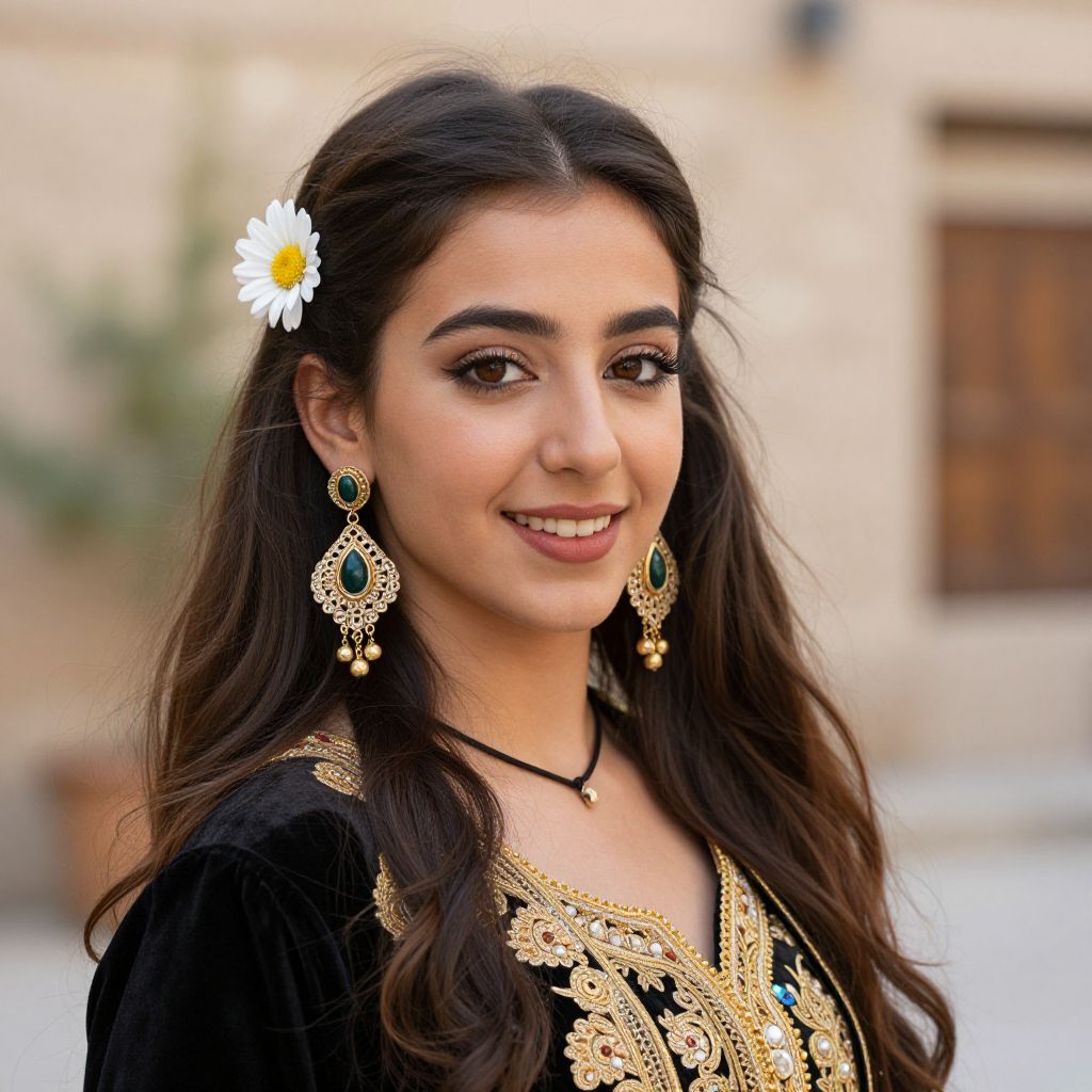 Dabke lebanese traditional, 1girl, solo, long hair, jewelry, earrings, brown hair, brown eyes, looking at viewer, smile, flower
