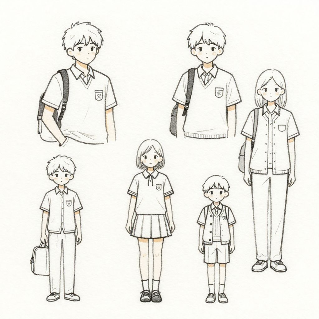 Easy anime sketches illustrating everyday scenes with minimal color and delicate outlines. Depict characters in school uniforms or casual wear with simple facial expressions and natural poses, perfect for rapid, clean anime concept art.