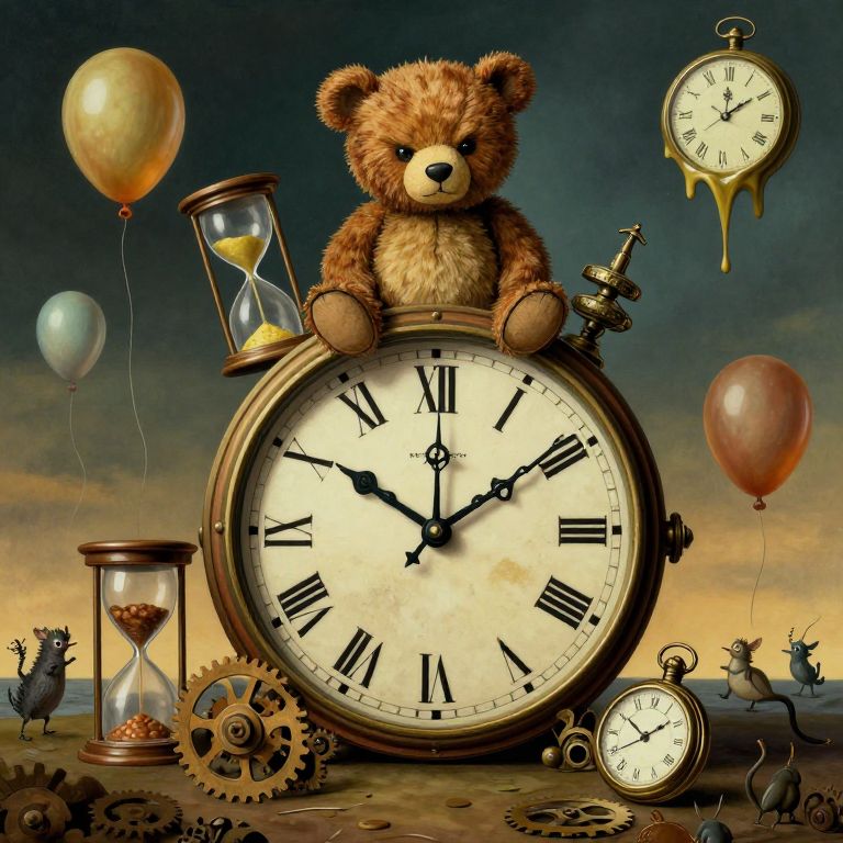 Craft an enchanting image in a surreal, dreamlike style reminiscent of Salvador Dali's iconic works, depicting a whimsical scene where a grumpy-looking teddy bear perches atop a colossal clock face, surrounded by various time-related artifacts like hourglasses and pocket watches. The scene should be captured from an \"ant's-eye view\" at the base of the clock, showcasing intricate details such as gears and cogs in the foreground, while evoking a surreal atmosphere with melting clocks, floating balloons, and peculiar creatures scurrying around the edges of the image. This unique composition should blend whimsy and mystery, capturing the passage of time in an enchanting, mind-bending visual narrative.