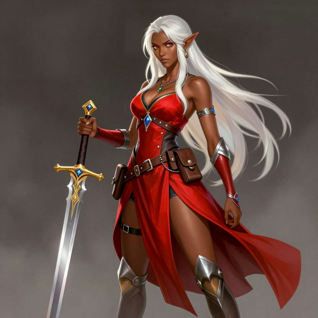 Digital illustration of a dark-skinned, elf-like warrior with long white hair, red eyes, and pointed ears. She stands confidently with a long sword in her right hand. She wears a deep red, revealing dress with armor on her arms and legs. Her outfit includes a belt with various pouches and a necklace. She has a serious expression. The background is dark and blurred. She is standing with her left leg slightly forward and her right leg back. Her hair flows down past her shoulders. The sword has a gold hilt. The armor is detailed with metallic ures. She is looking forward. The overall style is realistic with a focus on fantasy elements. The image includes one person.