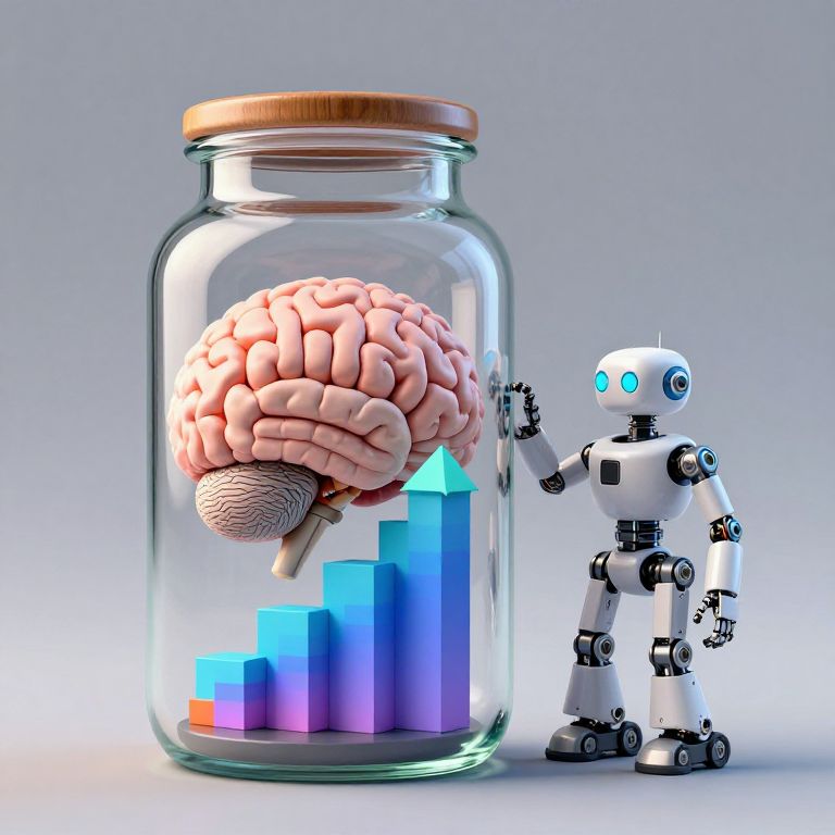 Renaissance Art a brain in a glass jar, an industrial robot], a colourful 3d pixel graph shape representing data in glass jar,