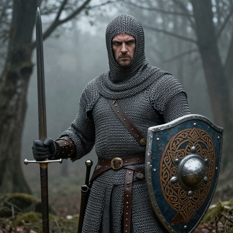 Photograph of a rugged, bearded man with fair skin, standing in a misty forest. He wears a full, chainmail armor suit with a hood, brown leather belt, and black gloves. His right hand grips a silver sword with a simple hilt, while his left hand holds a round, ornate shield featuring a blue background with a Celtic knot pattern around a silver boss. The background is blurred, with tall, dark tree trunks and a foggy atmosphere. The overall color palette is muted, with grays, browns, and greens, creating a medieval, fantasy-like ambiance.