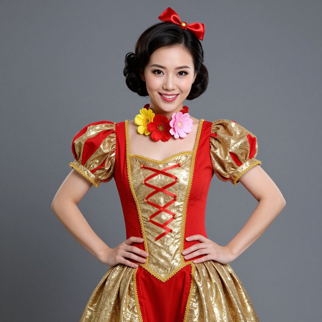 Upsy Daisy Costume, woman in a red and gold outfit with flowers on her neck