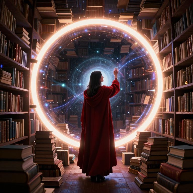 A digital art image depicting a woman with long dark hair, dressed in a red cloak, standing in the center of a library. She faces a glowing, circular portal of bright white and blue lights, with her right hand raised. The library is filled with tall, dark wooden bookshelves on both sides, stacked with books. Stacks of books are also scattered on the floor in front of her. The background shows a starry, cosmic sky through the portal. The scene is illuminated by the bright portal, contrasting with the dark, shadowy library. The style is a blend of fantasy and science fiction.
