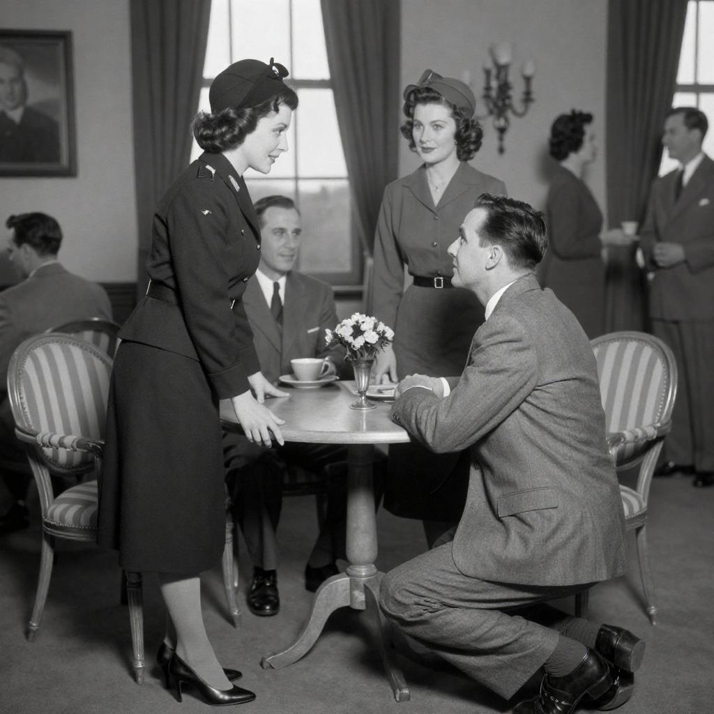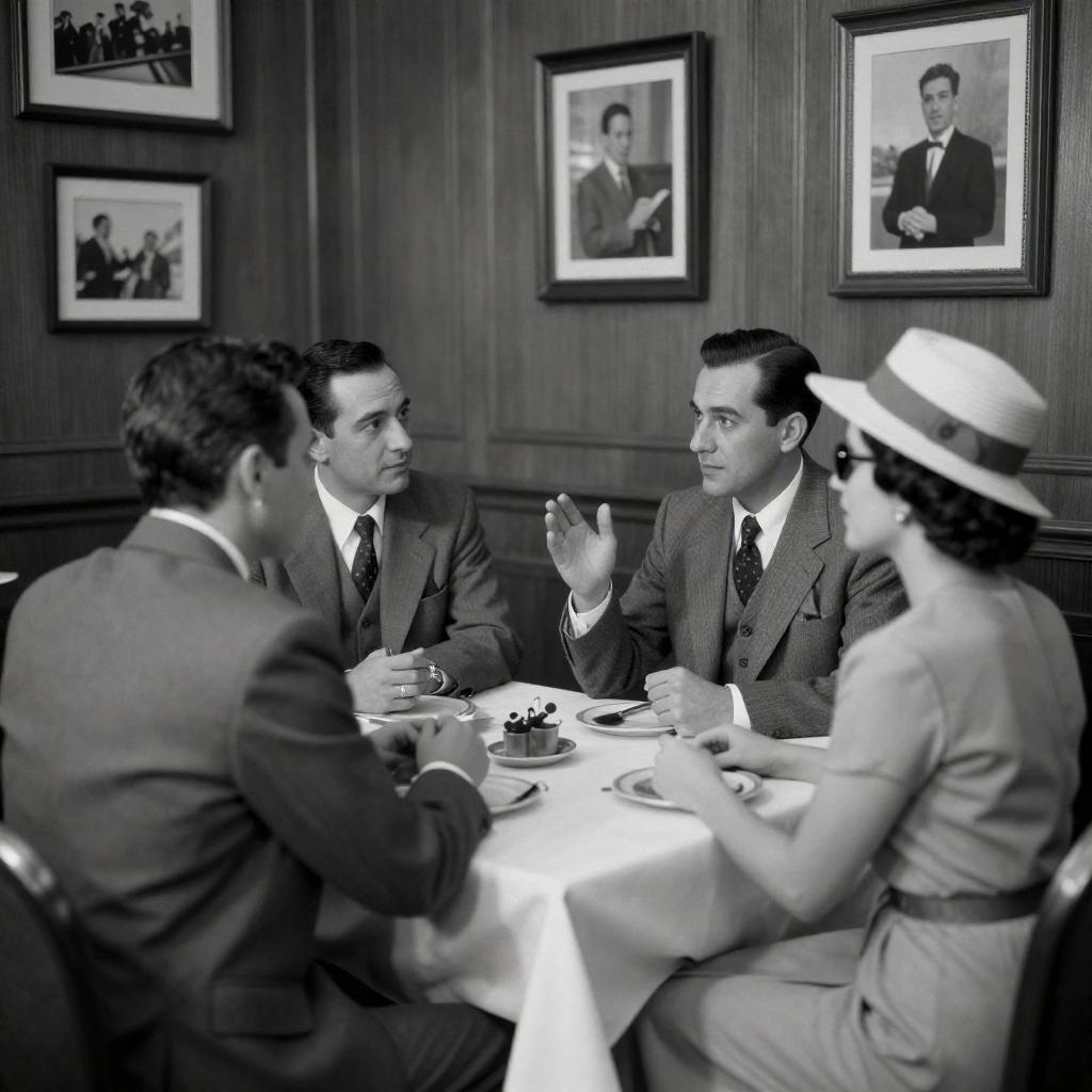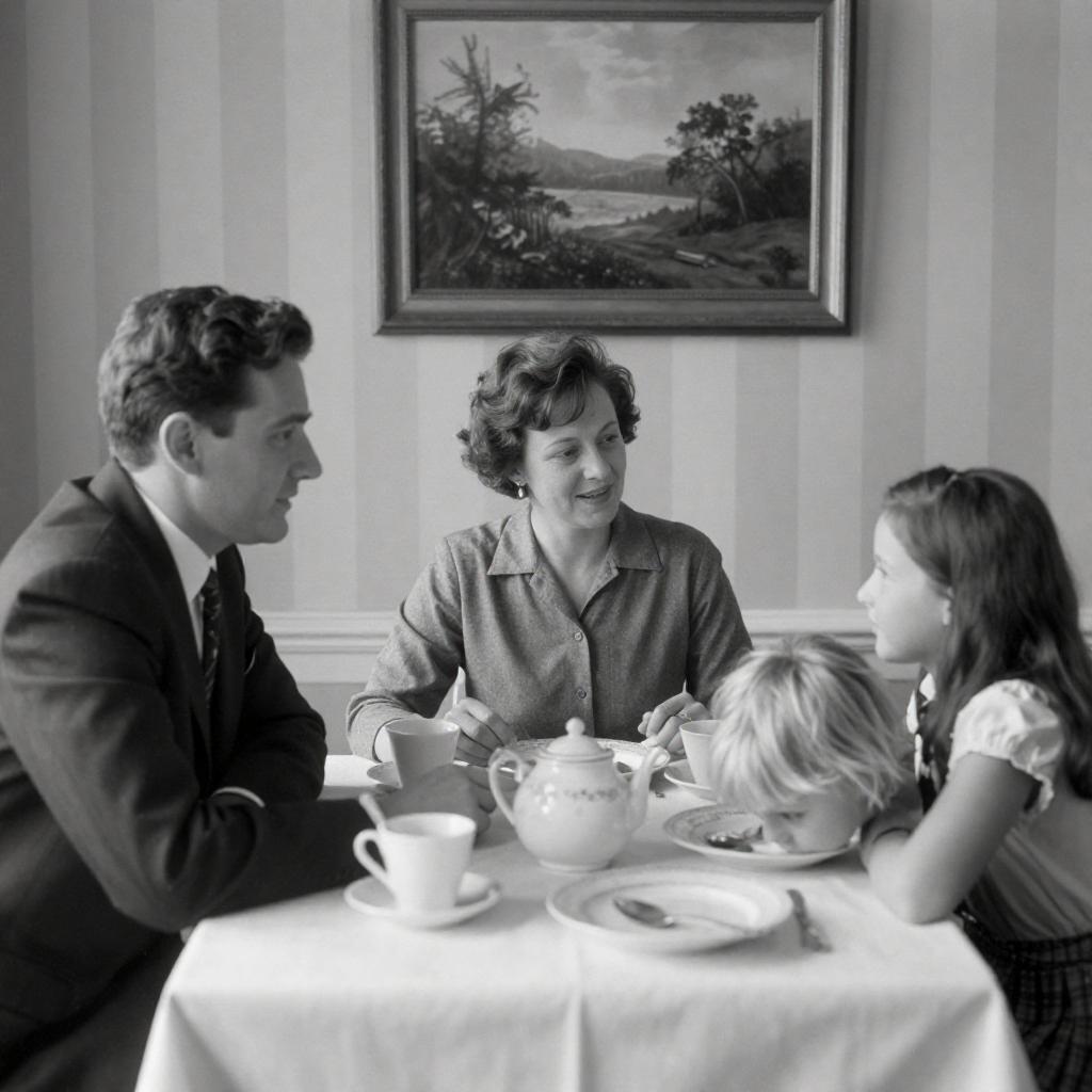 Sepia-toned photograph of a vintage living room. A woman in a white blouse and dark skirt stands beside a lit fireplace, while a man in a dark suit and tie sits on a patterned armchair. Bookshelves and framed pictures adorn the background. The man's legs are crossed, and he gazes at the woman.
