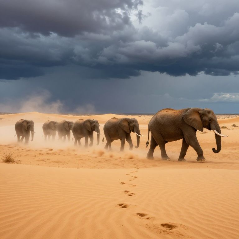 A group of elephants crossing a wide desert with a golden sandy landscape, dramatic storm clouds gathering overhead, dynamic composition with dust swirling, detailed elephant footprints in the sand, mix of warm and cool tones creating mood and atmosphere.