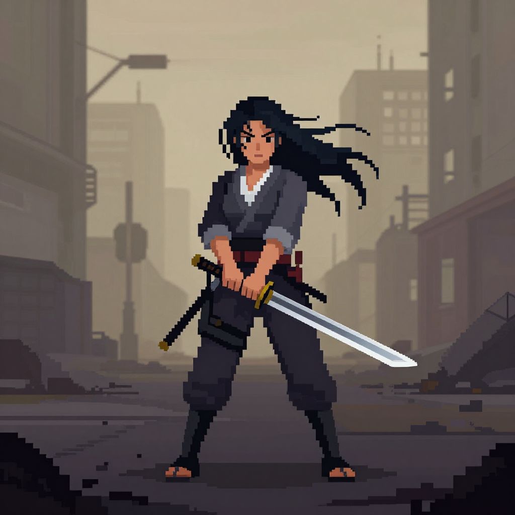 Pixel art, Post apocalypse, In the thick fog of a dilapidated city, in the middle of a dilapidated street, a samurai woman stands ready for a confrontation, clutching a long samurai knife with both hands, Her gaze is fixed on the camera lens, the wind blowing through her long hair flutters around her, the samurai woman is in a steady pose, firm, in a determined stance, the wind heightens the sense of anticipation, A charged atmosphere of emptiness, despair and tiredness, A dim, dystopian background with a warm, industrial tone - soft lighting