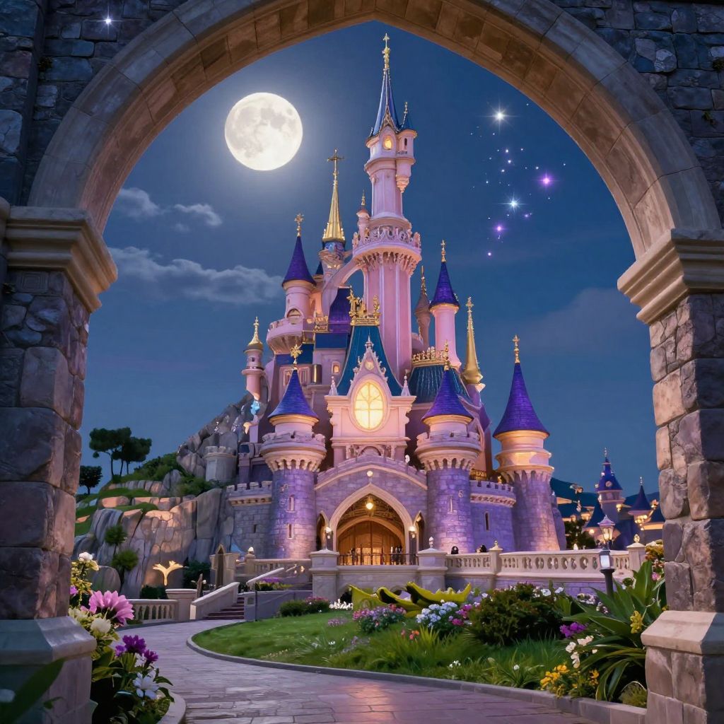 Digital illustration of a fairy-tale castle with blue turrets, illuminated by a full moon, framed by a stone archway, surrounded by colorful flowers