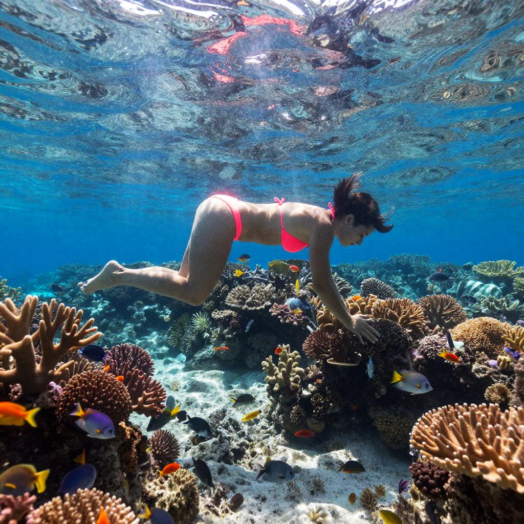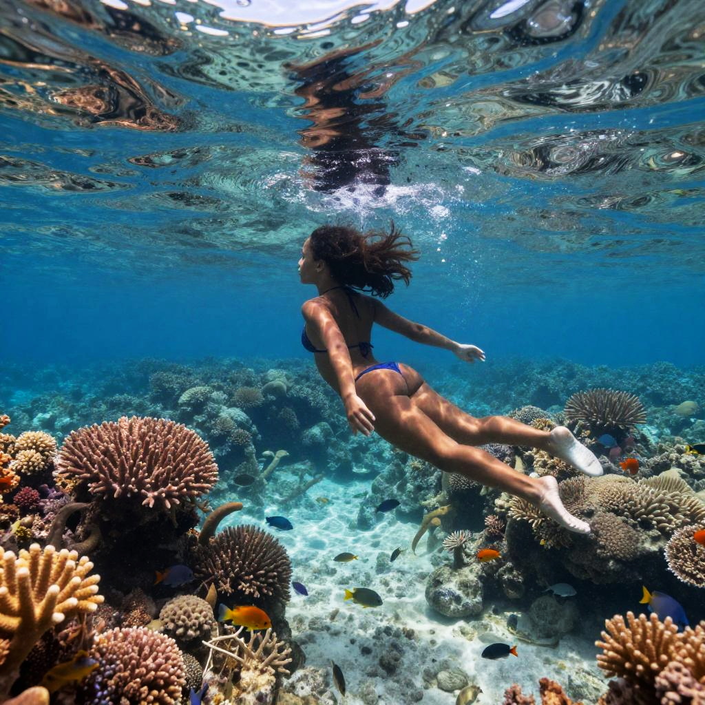 Transparent clear swimsuits floating in crystal clear ocean water, tropical fish and coral reef in the background, hyper-realistic water transparency effects, strong sunlight filtering through, dynamic and colorful underwater scene