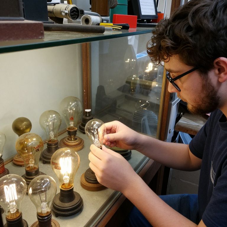 A realistic photo of a collection of vintage bulbs displayed in a glass case in a small garage-turned-museum, each bulb with distinct markings and worn glass, surrounded by tools and old electrical components, a teenage boy with a curly beard and glasses adjusting a bulb with a careful expression in the foreground.