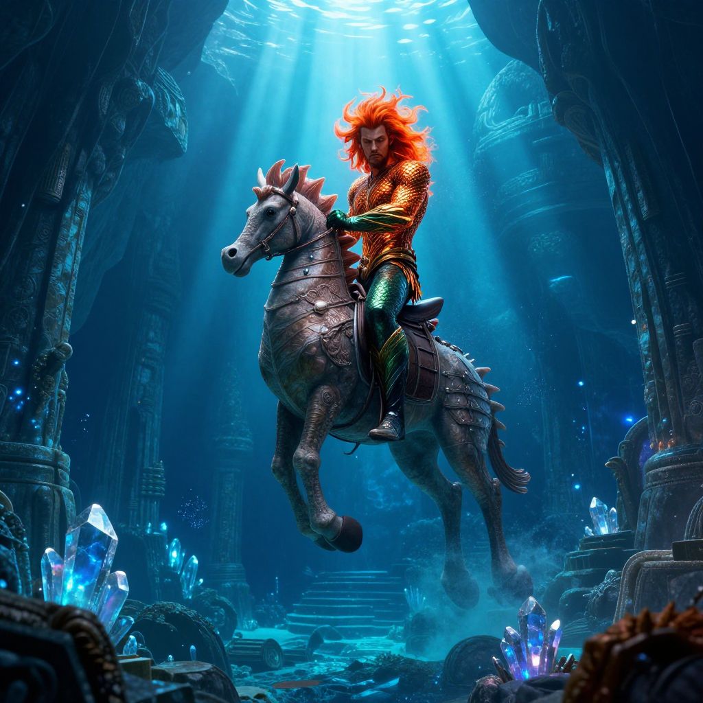 Aquaman with fiery red hair riding a giant seahorse through deep sea caverns, enchanted underwater setting with glowing crystals and ancient ruins illuminated by shafts of light, epic fantasy artwork with detailed character design and environment.