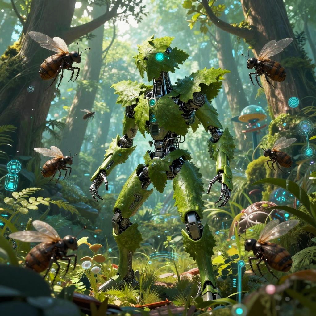 A bioengineered forest scout, with leafy cybernetic limbs, surrounded by hovering mechanical insects, in a vibrant techno-organic jungle, depicted in the genre-blending and ethereal style of Yoko Kanno.
