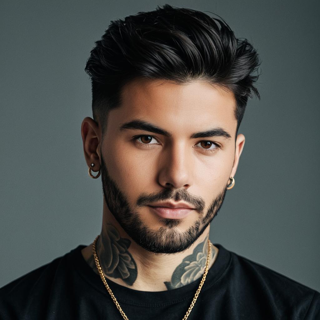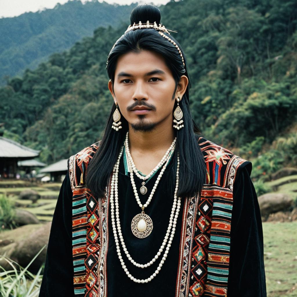 Portrait of Asian Man with Samurai Hairstyle and Beaded Necklace