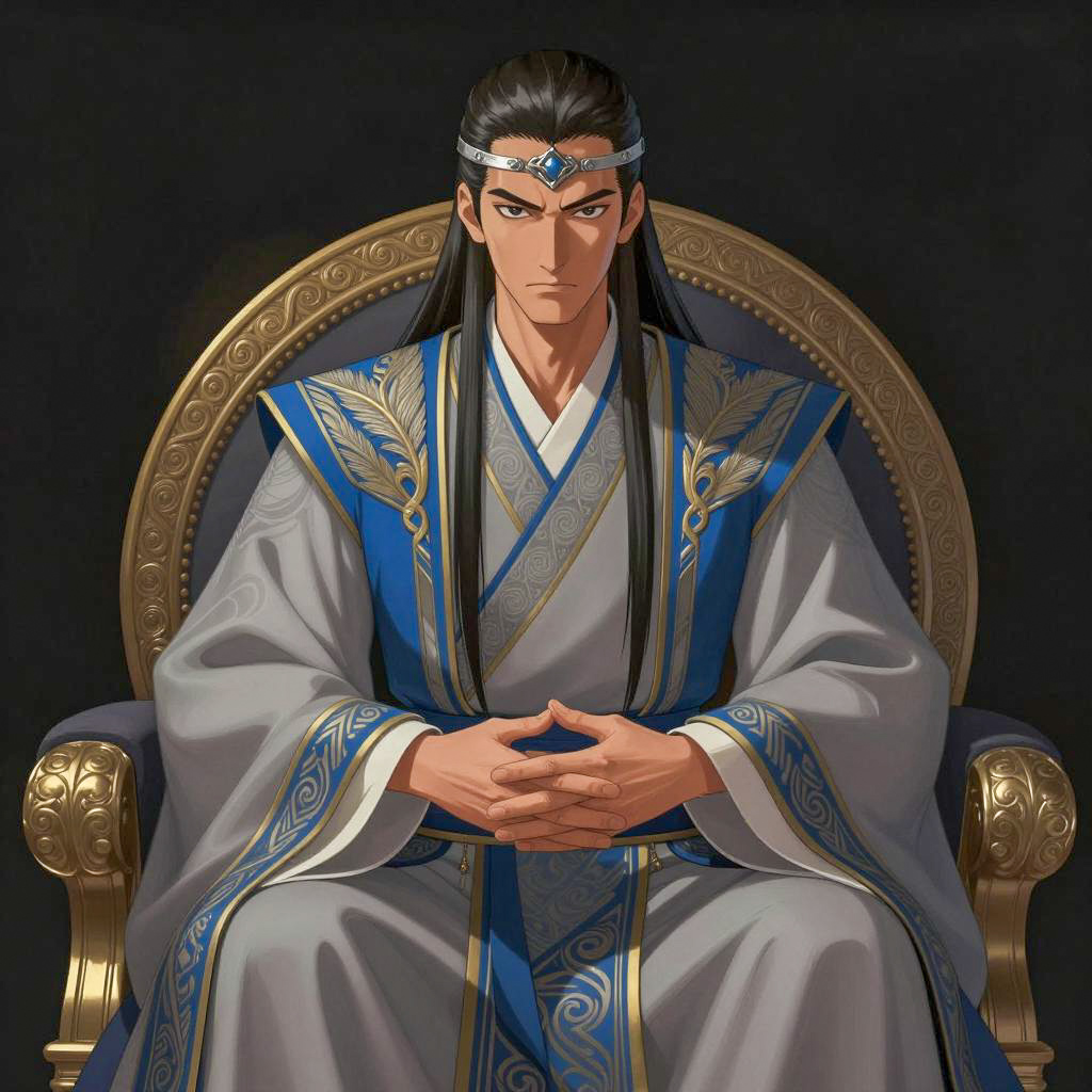 Illustration of a stern-looking man with long black hair, wearing a detailed grey robe with blue and gold trim, sitting on a round ornate chair. He has a silver headpiece, folded hands, and a dark background.
