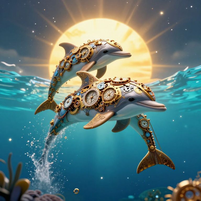 Enchanted by the celestial dance of time, clockwork dolphins glide through a cosmic ocean of golden stars and ethereal light, embodying the eternal rhythm of freedom and wonder.