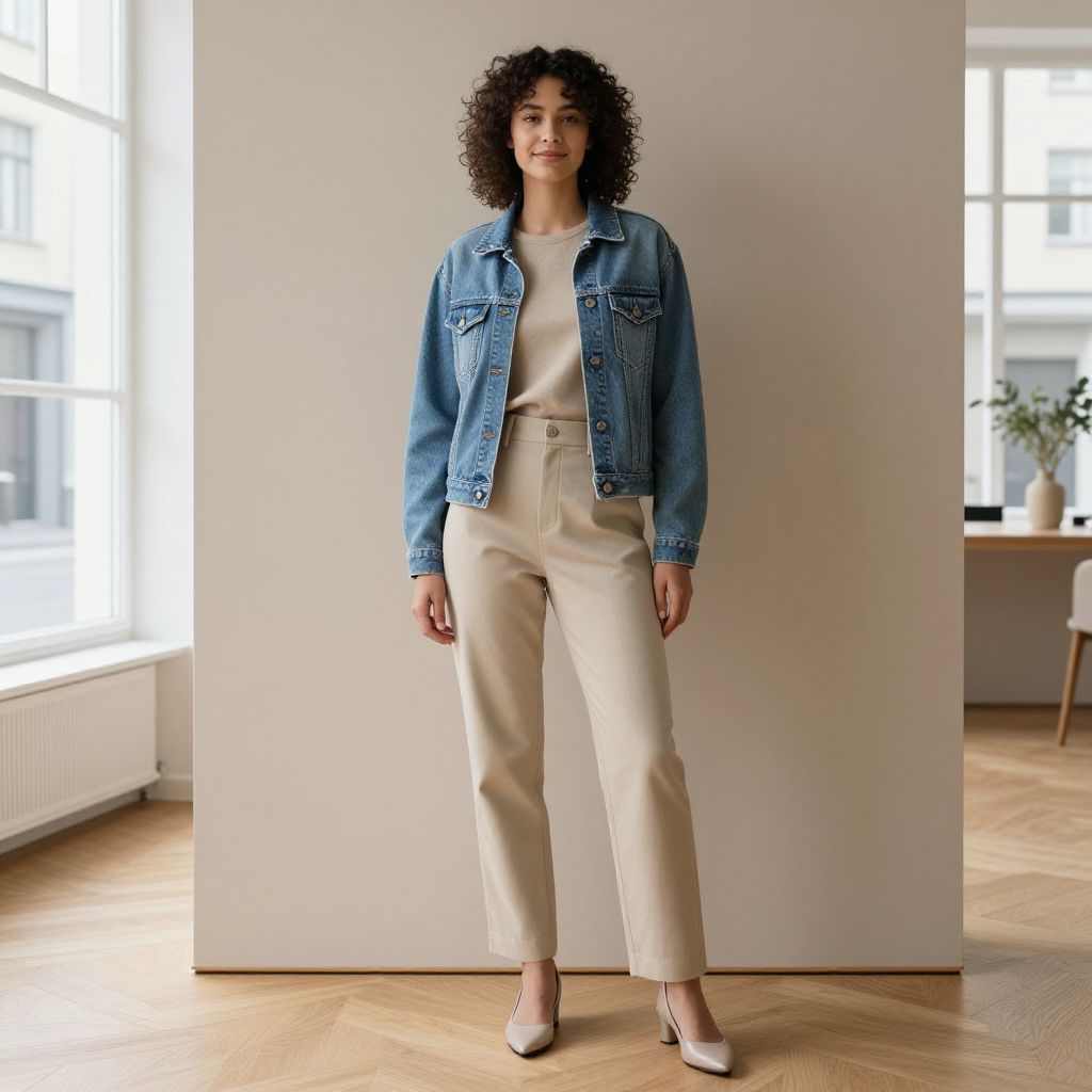 A model with fair skin, natural curly hair, and a gentle smile is posing in a minimalist Scandinavian studio, wearing beige high-waisted pants with a light blue denim jacket, standing against a neutral beige wall with wooden floors and large windows showing a quiet urban courtyard.