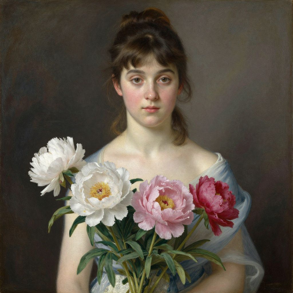 Classical oil painting of a young woman with fair skin and brown hair, holding a bouquet of large, colorful peonies against a dark background.