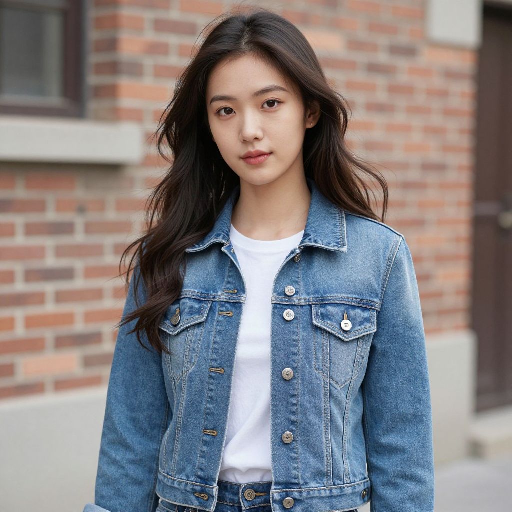 Photograph of an East Asian woman with fair skin and long, dark brown hair in a single braid, standing outdoors. She wears a light pink, button-up jacket over a white t-shirt, paired with matching pink pants and a pink belt. Her expression is neutral, and she gazes directly at the camera. The background is blurred, showing a busy urban setting with indistinct people and trees. The bright pink outfit contrasts with the white t-shirt, and the overall style is modern and chic. The image has a sharp focus on the woman while the background remains soft.