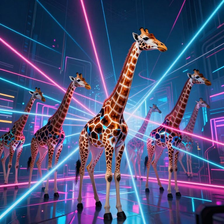 A cyberpunk-inspired digital artwork featuring giraffes with mirrored skin wandering through a prismatic maze of neon beams and lasers, their reflections intertwining into alternate versions of themselves as they move, creating a surreal and high-definition visual effect.