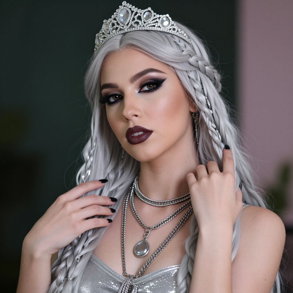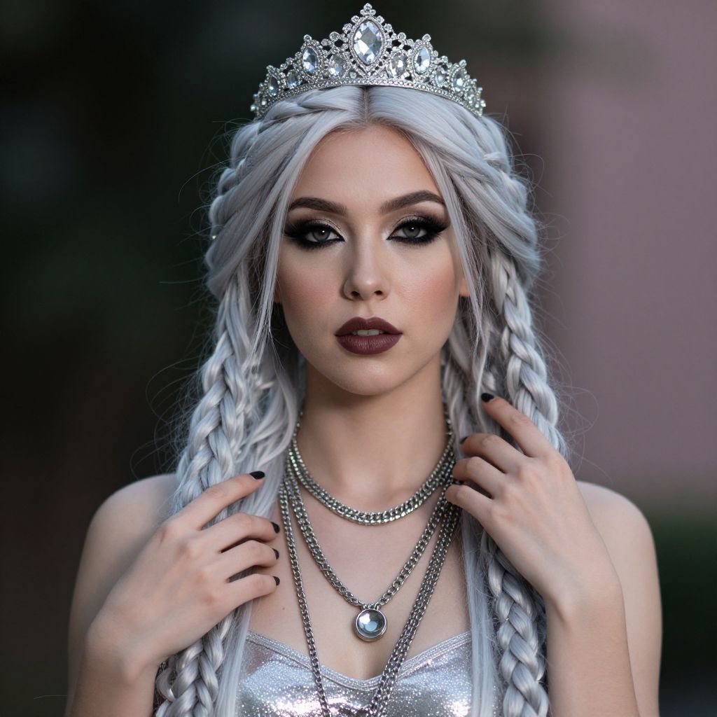 This is a photograph of a woman with long, silver-white braided hair and a sparkling silver tiara. She's wearing dramatic black eyeliner and dark lipstick, with multiple shiny silver necklaces and a silver top. Her hands are gently touching her hair and neck. The background is blurred, with dark green and pinkish hues. She has a mysterious, almost ethereal look.