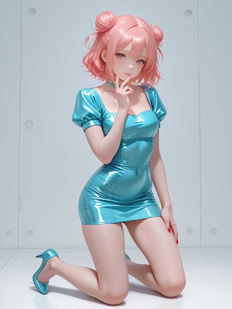 1girl, realistic face, full body shot, Woman, modern chic, bodycon mini dress in pastel blue, square neckline, short puff sleeves, fitted waist, thigh-length, red nail polish, white studio background.