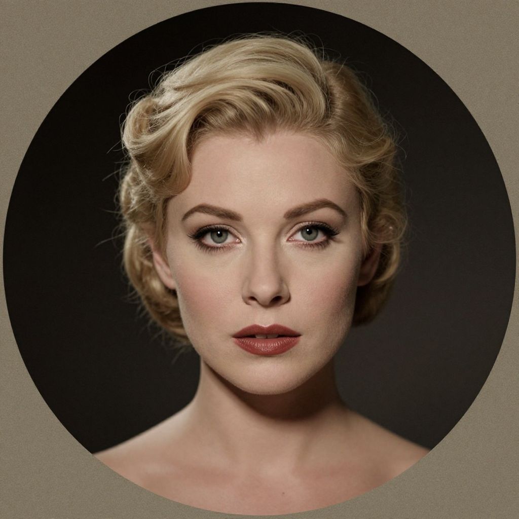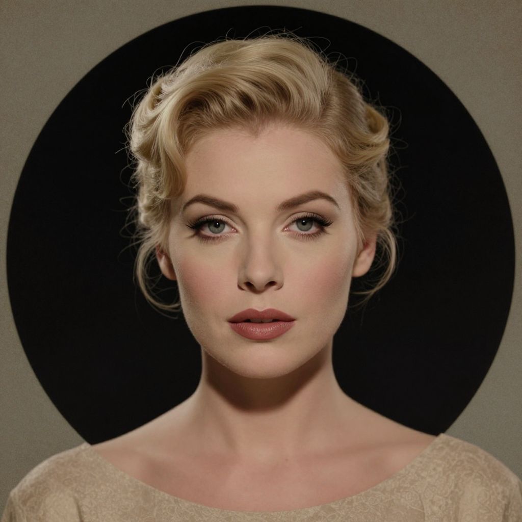 A striking digital portrait featuring a woman with blonde hair styled in a classic updo, set against a vintage-inspired background with a dark circular vignette, evoking a timeless and cinematic aesthetic reminiscent of Tom Bagshaw's dramatic and moody style.