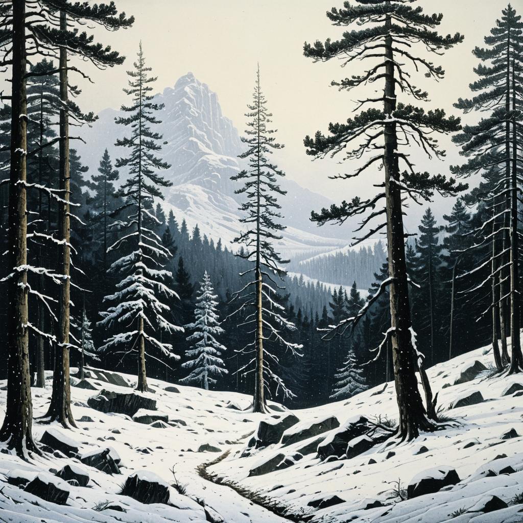 Detailed illustration of a snow-covered pine forest with tall trees and rugged rocks, featuring a serene winter landscape with distant mountain peaks under a pale sky. The scene captures the quiet beauty of a winter wilderness, emphasizing the contrast between dark pine trees and white snow.
